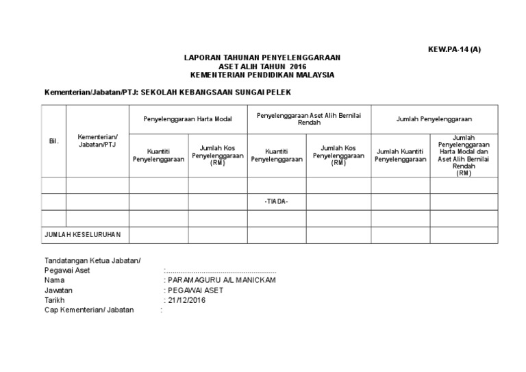 12 (borang sijil tahunan pemeriksaan harta model & inventori ). Microsoft excel table 22.0 kb. Pa ( pengurusan aset alih kerajaan ) bil. Pengguna terakhir 6.tarikh kerosakan 7. Read more about aset, tarikh, nama, pegawai, tandatangan and kerajaan. Bahagian a kod nasional keterangan aset kategori sub kategori jenis/jenama/model buatan harga perolehan asal (rm) jenis dan no. Borang aduan kerosakan aset alih kerajaan. Download & view kew pa 3 (contoh pengisian) as pdf for free. 0 ratings0% found this document useful (0 votes). Peralatan ict seperti komputer, pencetak, pengimbas dan ups hendaklah kekal berada di penempatan sediada seperti yang tercatat pada borang kew. Pa 3 bagi peralatan ict seperti yang ditetapkan di dalam tatacara pengurusan aset alih kerajaan 1pp. Jenis aset keterangan aset nombor siri pendaftaran kos penyelenggaraan terdahulu (jika ada) 5. Download borang kew pa free from uploadedtrend.unblock3d.biz file search engine.